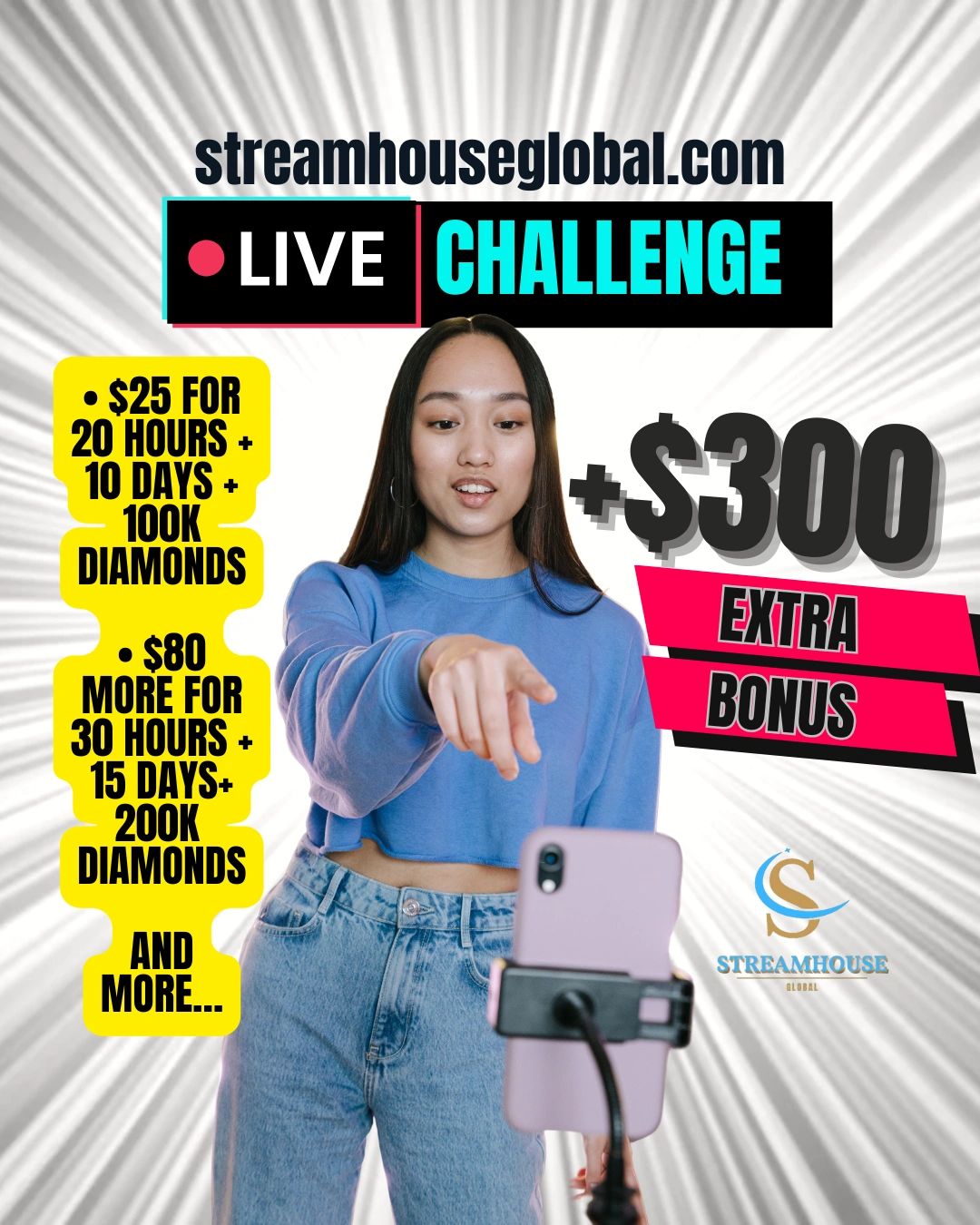 At StreamHouse Global, we’re rewarding new creators who stream with purpose! Join our LIVE CHALLENGE for a chance to earn up to $300 in bonuses.